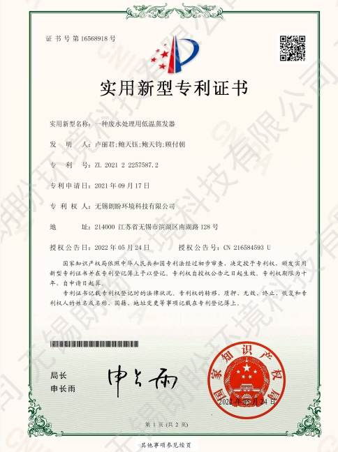 無(wú)錫朗盼環(huán)境科技有限公司是一家集研發(fā)、生產(chǎn)、銷(xiāo)售為一體的高新技術(shù)公司。主要生產(chǎn)低溫?zé)岜谜婵照舭l(fā)器和結(jié)晶器等污水處理設(shè)備、以高濃高鹽廢水蒸發(fā)處理、液態(tài)危險(xiǎn)廢棄物濃縮減量和物料資 源化回收為主營(yíng)業(yè)務(wù),為客戶(hù)提供工業(yè)污水零排放低溫蒸發(fā)技術(shù)整 體解決方案。公司積極響應(yīng)國(guó)家號(hào)召,秉承著“綠色環(huán)保,節(jié)能 減排”的企業(yè)愿景,全力推動(dòng)企業(yè)向科技創(chuàng)新、品牌創(chuàng)新的方向發(fā)展 是國(guó)內(nèi)第一家研發(fā)、制造低溫熱泵蒸發(fā)器、第一個(gè)申請(qǐng)發(fā)明專(zhuān)利的廠 家。并取得多項(xiàng)國(guó)家發(fā)明、實(shí)用專(zhuān)利及軟著證書(shū)40余項(xiàng)及江蘇省工業(yè)與信息化廳新技術(shù)新產(chǎn)品認(rèn)定證書(shū)。